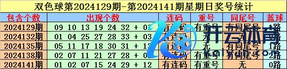 双色球在第2024129期-第2024141期周日开奖中,每期齐包含连码组合,连码开出比例100%;有3期开奖包含了重号,重号出现比例较低;同尾号码出现了3次,走势相对较冷。