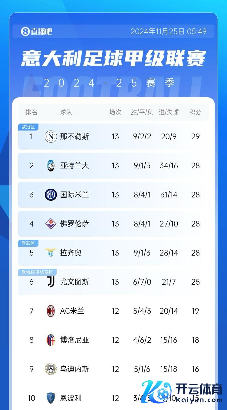 意甲那不勒斯只消1分上风,亚特兰大、国米、佛罗伦萨和拉皆奥4队同积28分。